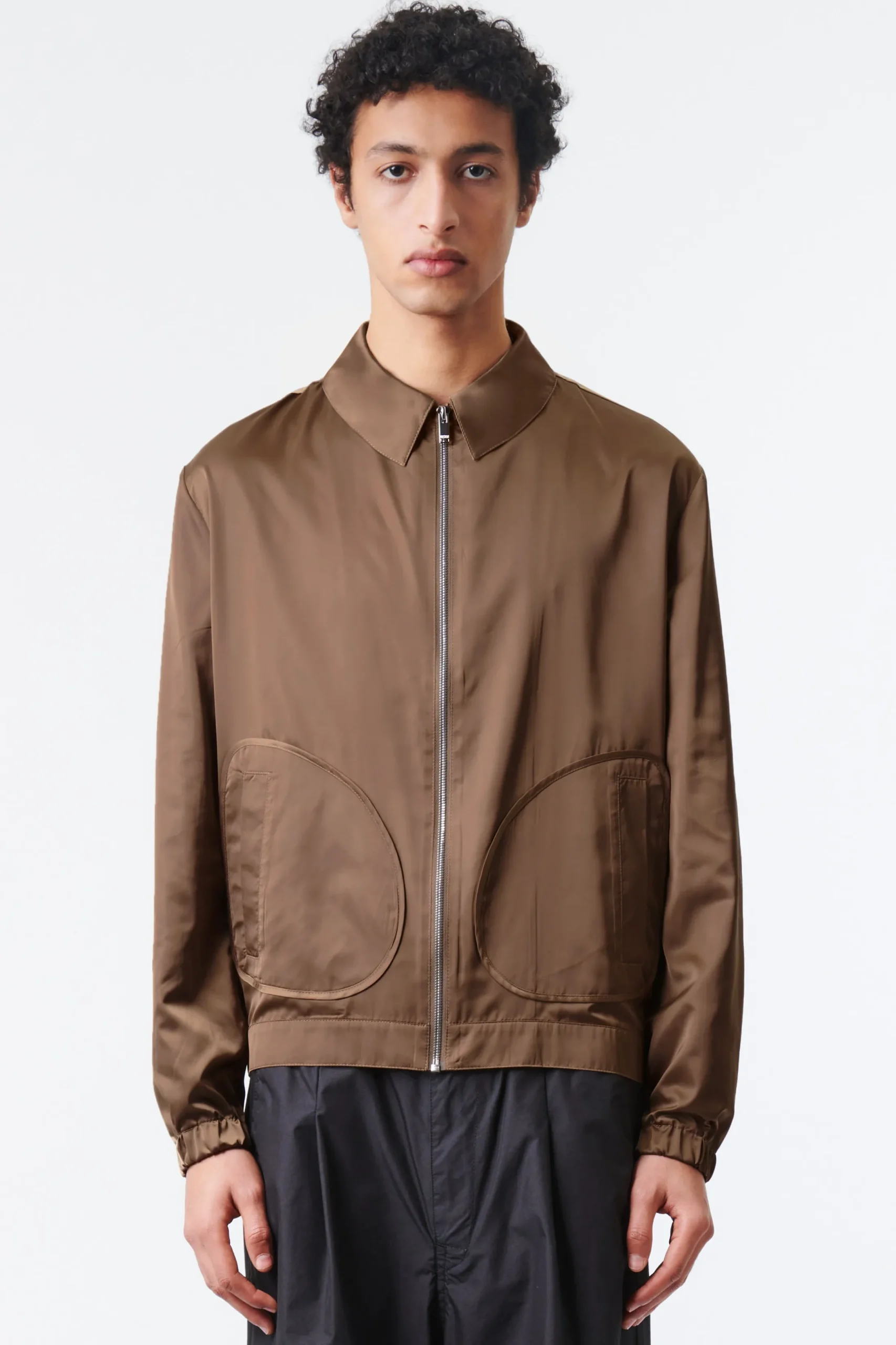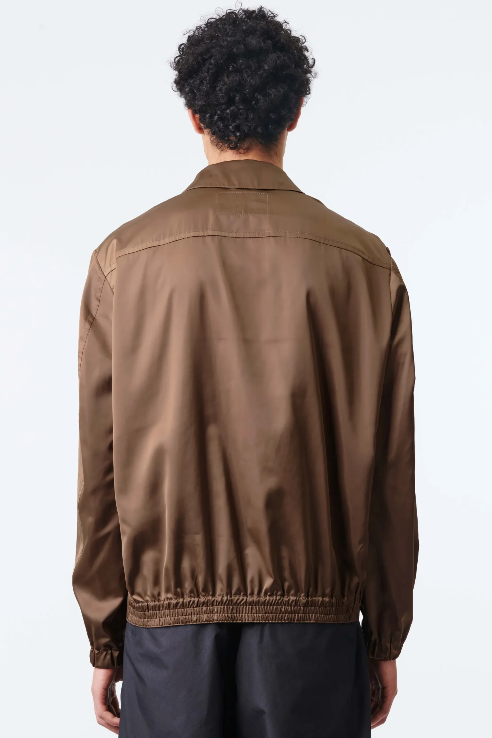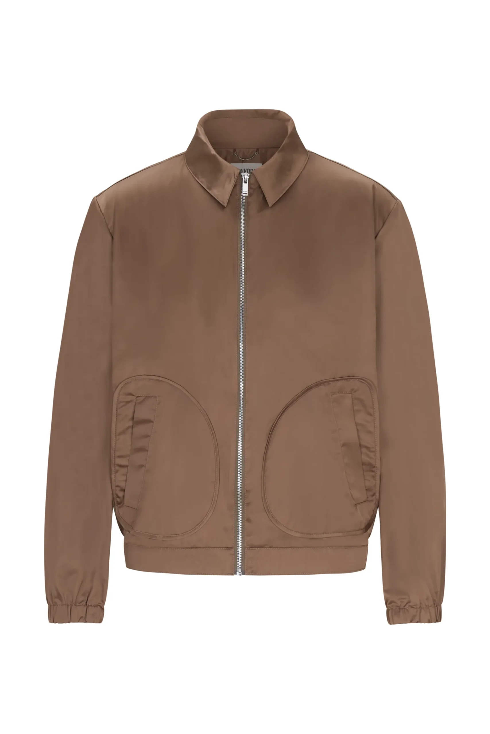 KARLONA is een blouson met een omgeslagen kraag en opgestikte, militair geïnspireerde zakken. Het bijzondere detail is de ronde zakvorm en de elastische manchetten op de rug. De vloeiende satijnen look voelt zacht aan.