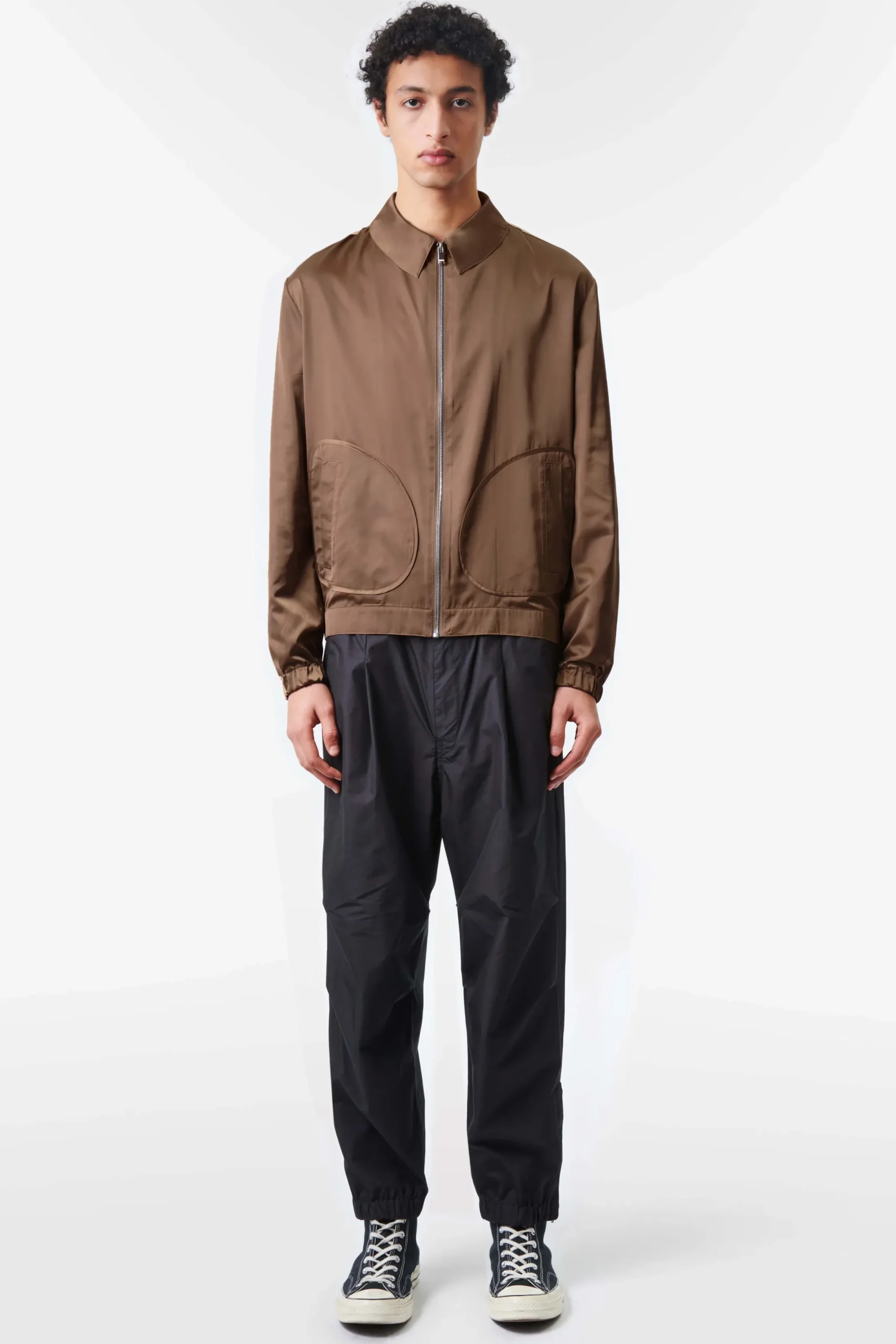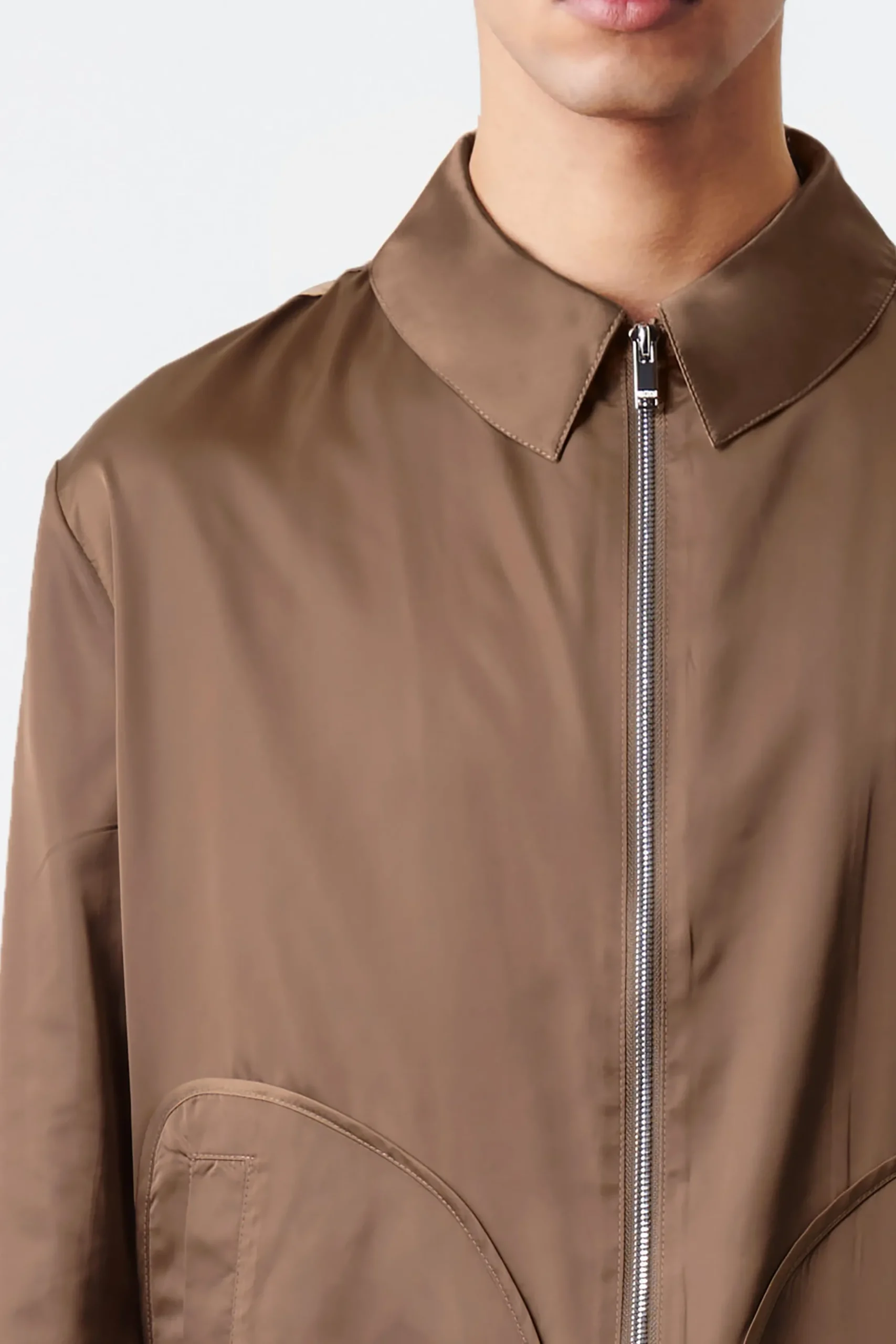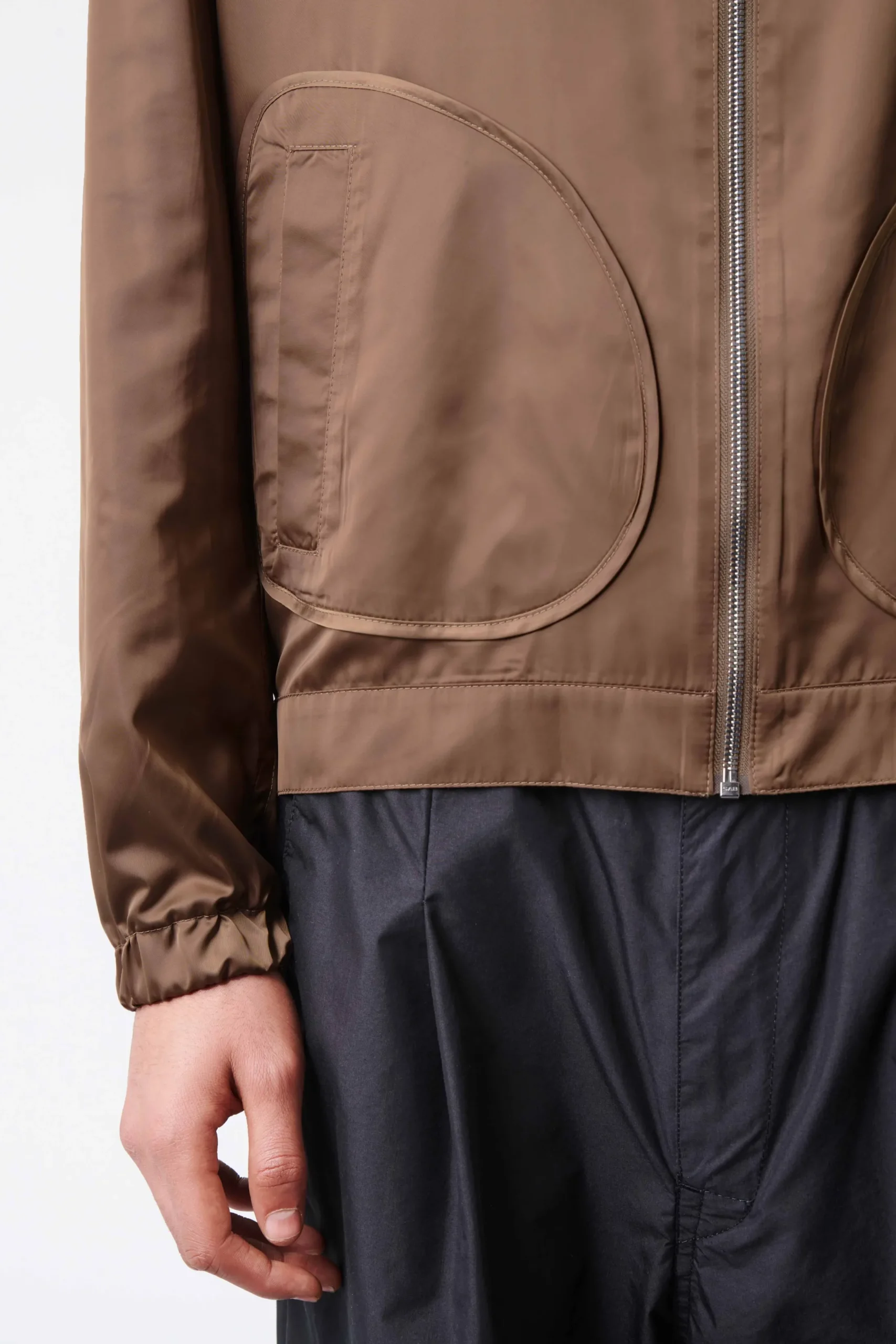 KARLONA is een blouson met een omgeslagen kraag en opgestikte, militair geïnspireerde zakken. Het bijzondere detail is de ronde zakvorm en de elastische manchetten op de rug. De vloeiende satijnen look voelt zacht aan.